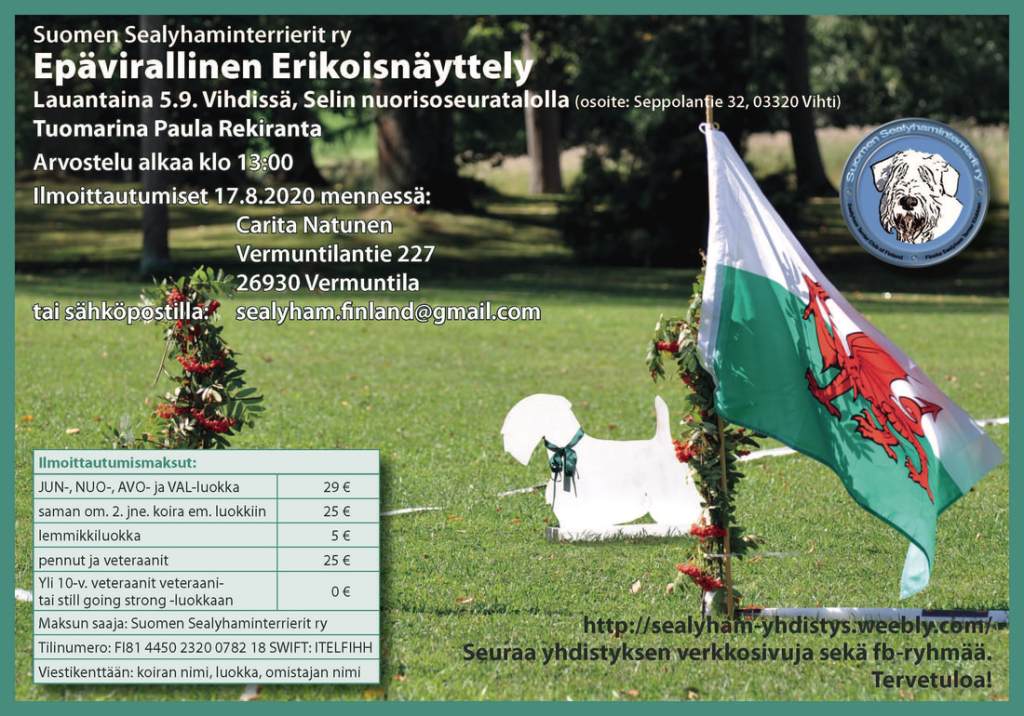Suomen Sealyhaminterrierit ry:n epäviralliseen erikoisnäyttelyyn Selin nuorisoseurantalolla Vihidissä 5.9.2020 osallistui 12 sealyhaminterrieriä. Näyttelyn tuomarina oli Paula Rekiranta.